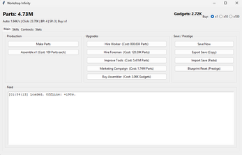Click to make Parts, hire Workers to generate Parts automatically, and invest in upgrades to scale faster. Unlock Gadgets and Assemblers, climb a simple skill tree, complete timed Contracts for rewards, and Prestige for Blueprints to push your run further each time.